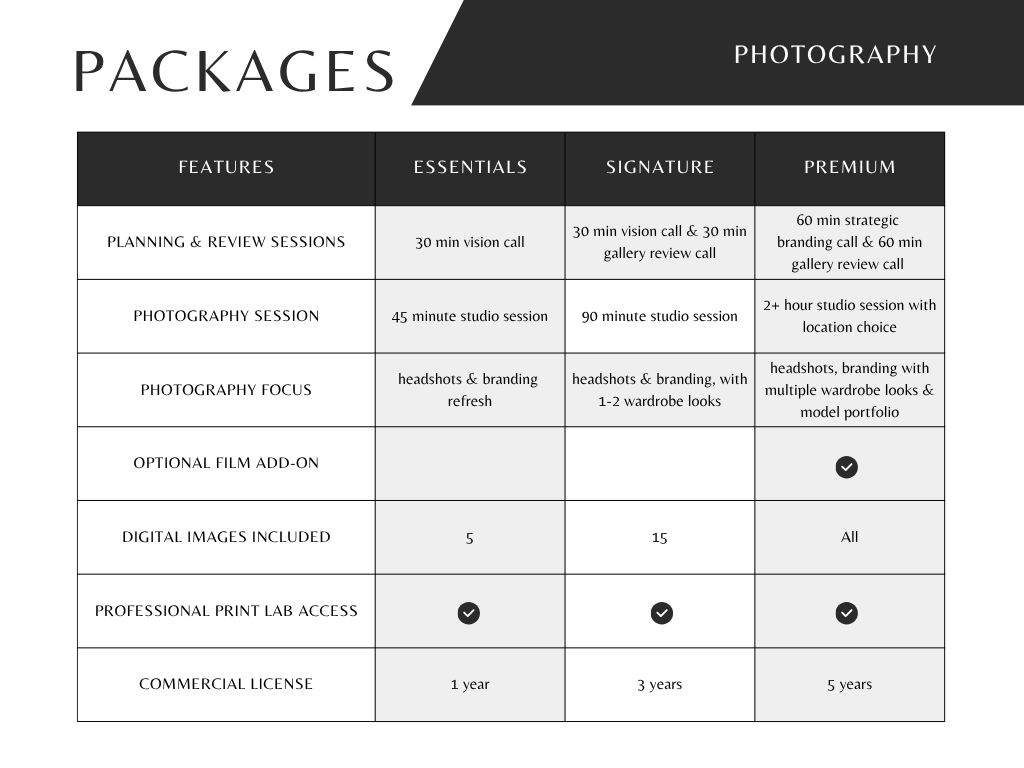 Listed below you’ll find three (3) packages for you to explore, depending on what you’d like included.
